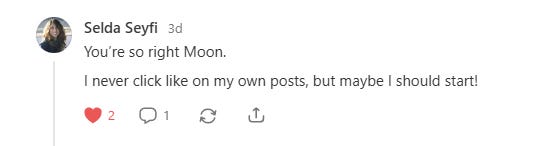 Thanks Moon, I enjoyed this, especially the part about liking yourself. It feels a bit wrong but you're correct, if we don't like our own stuff, how can we expect others to like it!